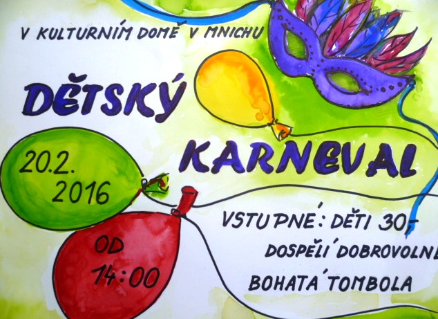 Mateřská školka Čtyřlístek Vás zve na Dětský karneval, který se koná v sobotu 20.2.2016 od 14 hod kulturním domě Mnich. Zváni jsou děti, rodiče, příbuzní, kolemjdoucísponzoři..prostě všicí kdo má rád zábavu.