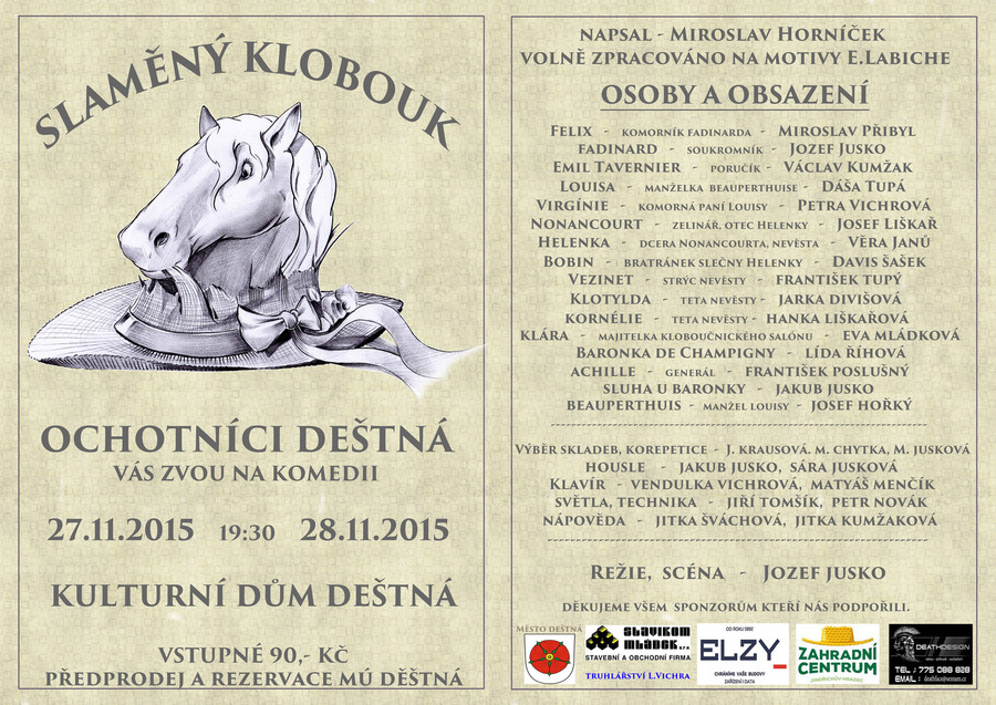 Ochotníci Deštná Vás zvou na komedii Slaměný klobouk konané dne 27.11.2015 a 28.11.2015.