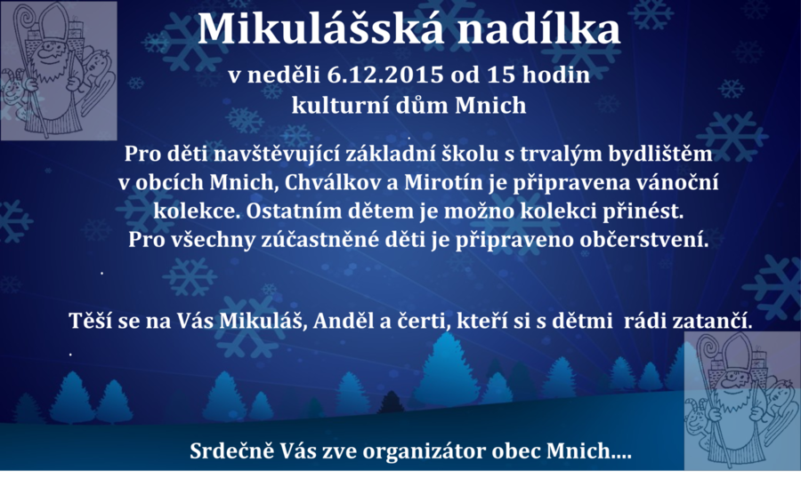 Zveme Vás na mikulášskou nadílku dne 6.12.2015 od 15 hodin.
